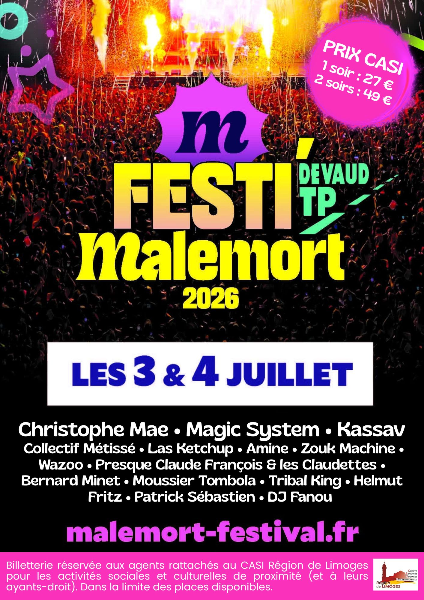 La billetterie pour le festival Festi'Malemort est ouverte et, comme chaque année, votre CASI est au rendez-vous pour vous proposer des places à petits prix !
