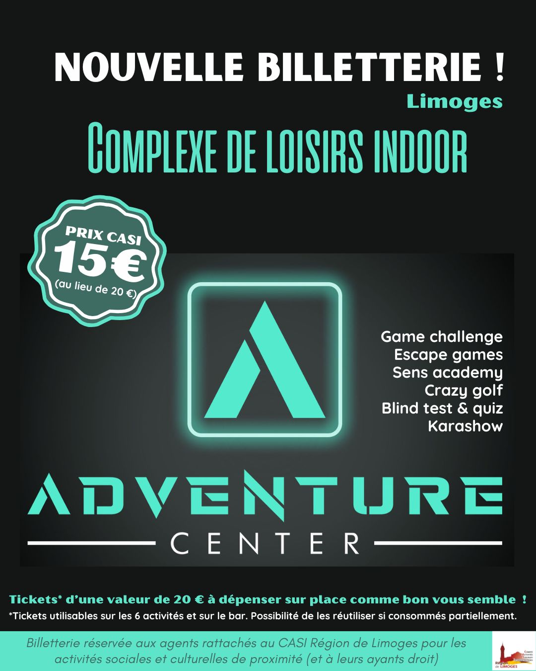 Fin 2025, le complexe de loisirs Adventure center a ouvert ses portes à Limoges et vous pouvez désormais acheter des tickets à prix réduit auprès de vos espaces CASI !