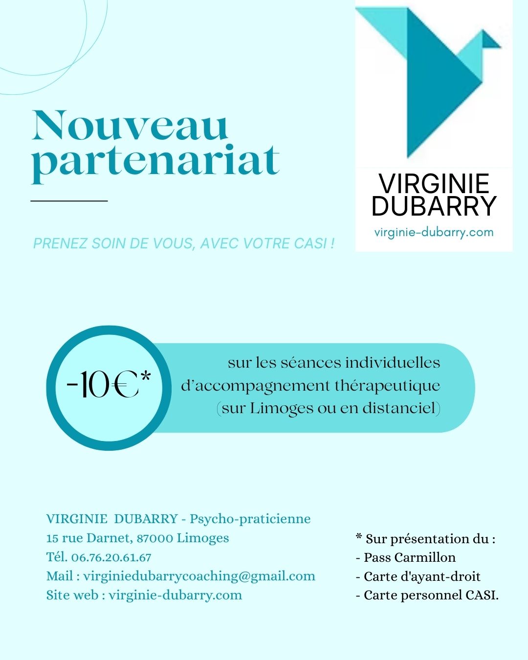 Sur présentation de votre Pass Carmillon (ou carte d’ayant droit ou carte du personnel CASI), elle vous propose 10 € de réduction sur ses séances individuelles d’accompagnement thérapeutique (sur Limoges ou en distanciel).