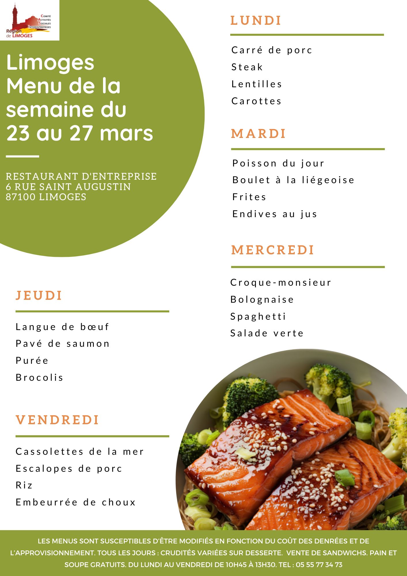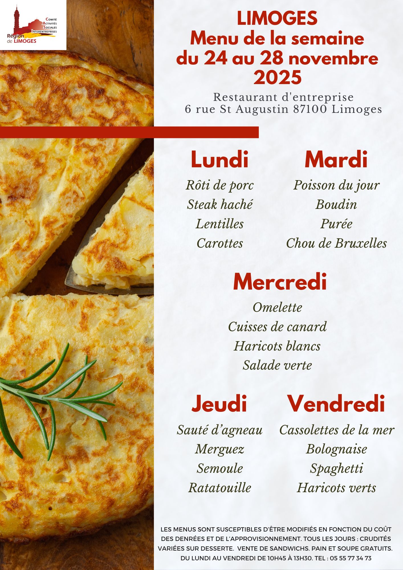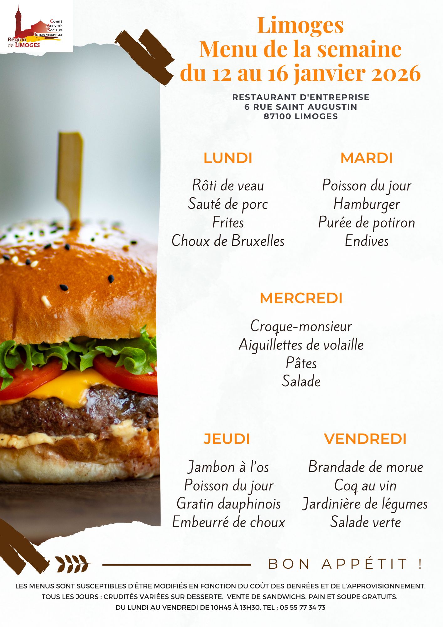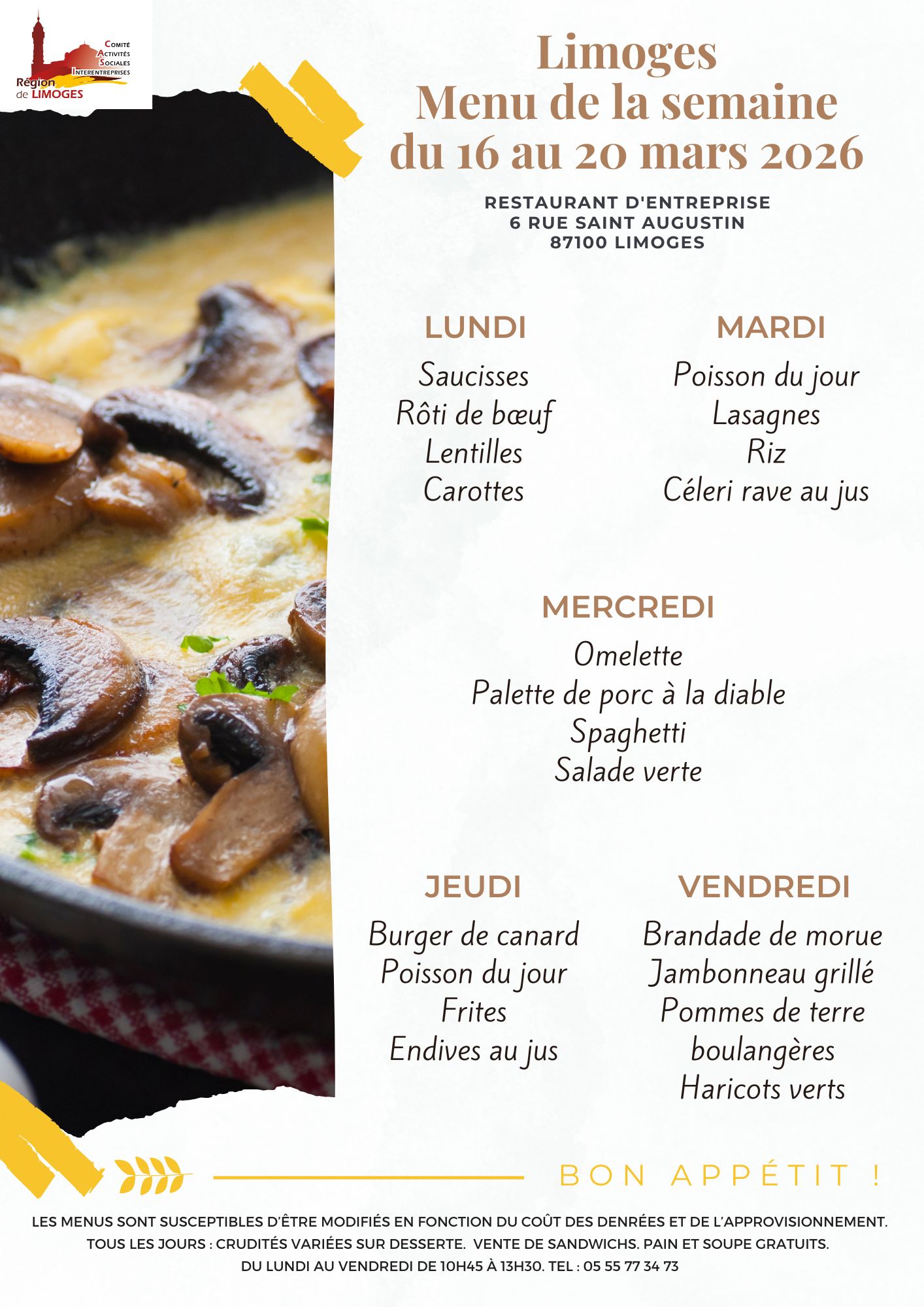 Chaque semaine, retrouvez sur cette page le menu de la semaine de votre restaurant de Limoges.