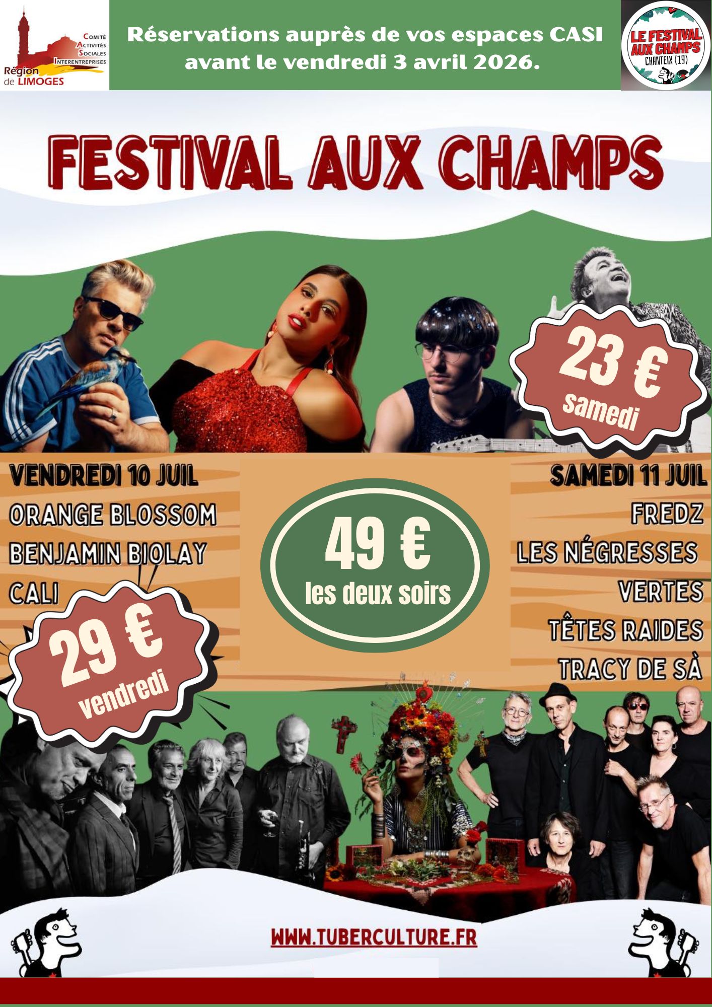 La billetterie pour le festival aux Champs de Chanteix est ouverte et, comme chaque année, votre CASI est au rendez-vous pour vous proposer des places à petits prix ! Pour l'édition 2026, le festival reçoit notamment Benjamin Biolay, les Têtes raides, Cali, Les Négresses vertes, Orange Blossom, etc. ! 🗓️ Date de l'évènement : vendredi 10 et samedi 11 juillet 2026. 💰 29 € le vendredi ; 23 € le samedi ; 49 € les deux soirs (dans la limite des places disponibles). 🔒 Clôture de la billetterie à prix CASI : vendredi 3 avril. Renseignements et achats dans vos espaces CASI. |